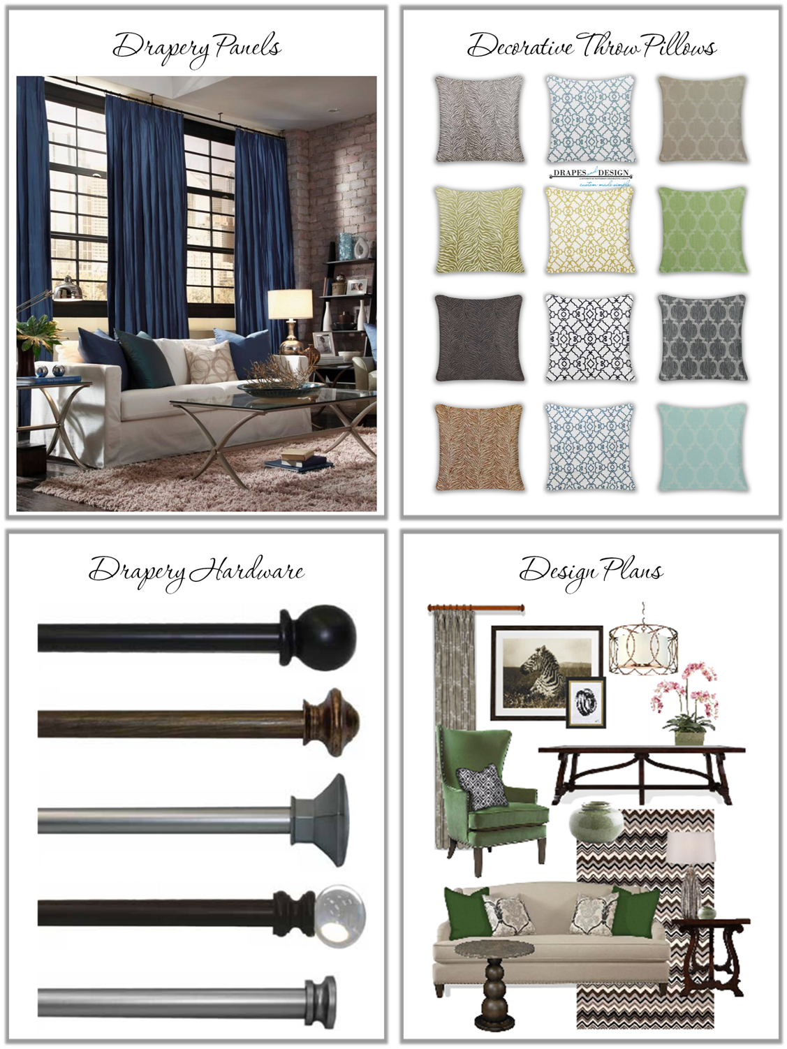 We offer custom made drapes, roman shades, pillows, hardware and E- Decorating all at affordable pricing.  Visit our site at www.DrapesandDesign.com or call us at 951-699-0760.